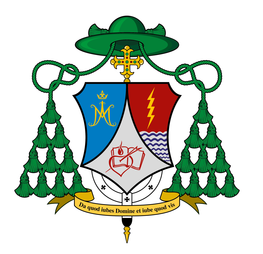 Lema Arzobispal Debajo del escudo en cinta centrada y aleteando en or (amarillo), el lema episcopal en letras negras: Da quod iubes Domine et iube quod vis.